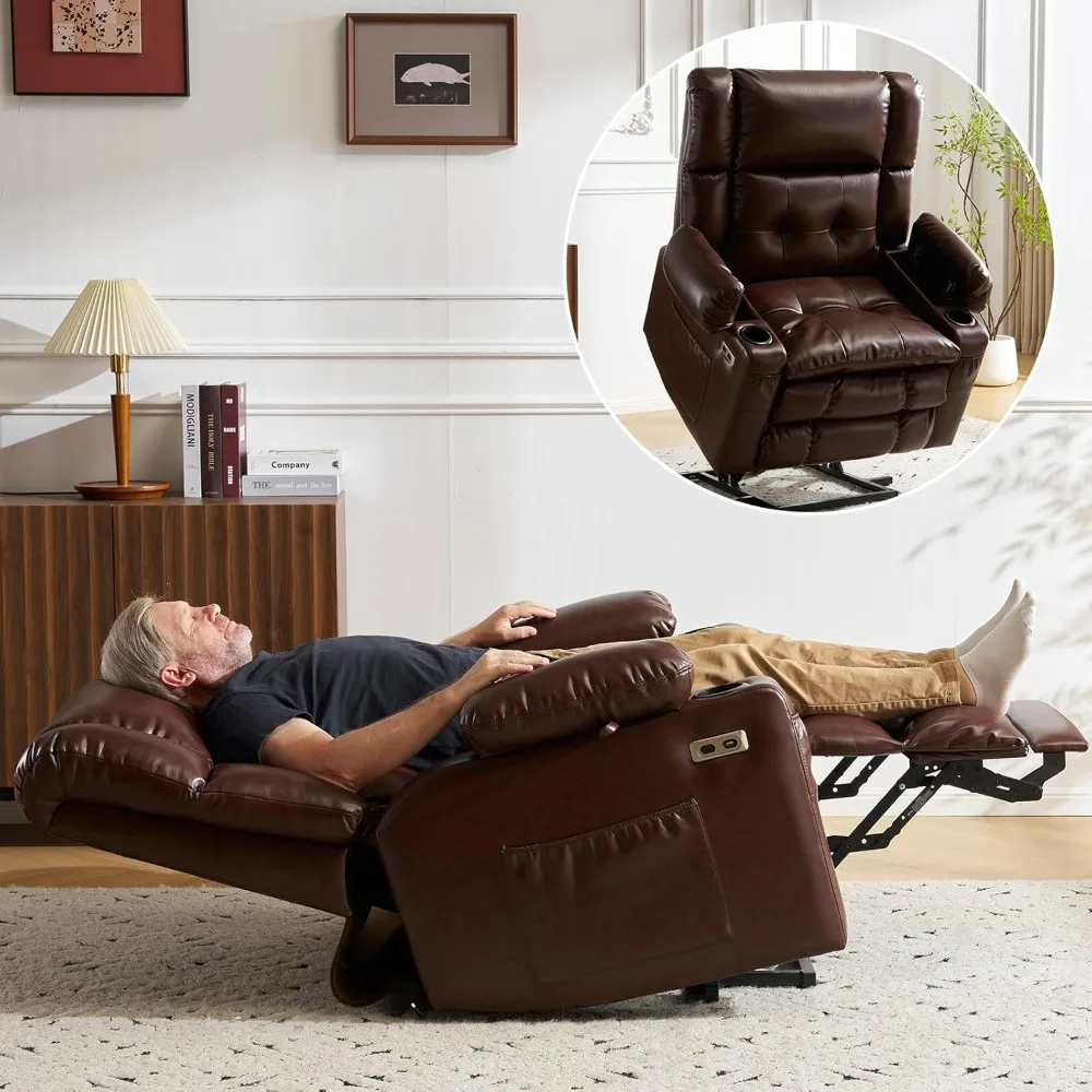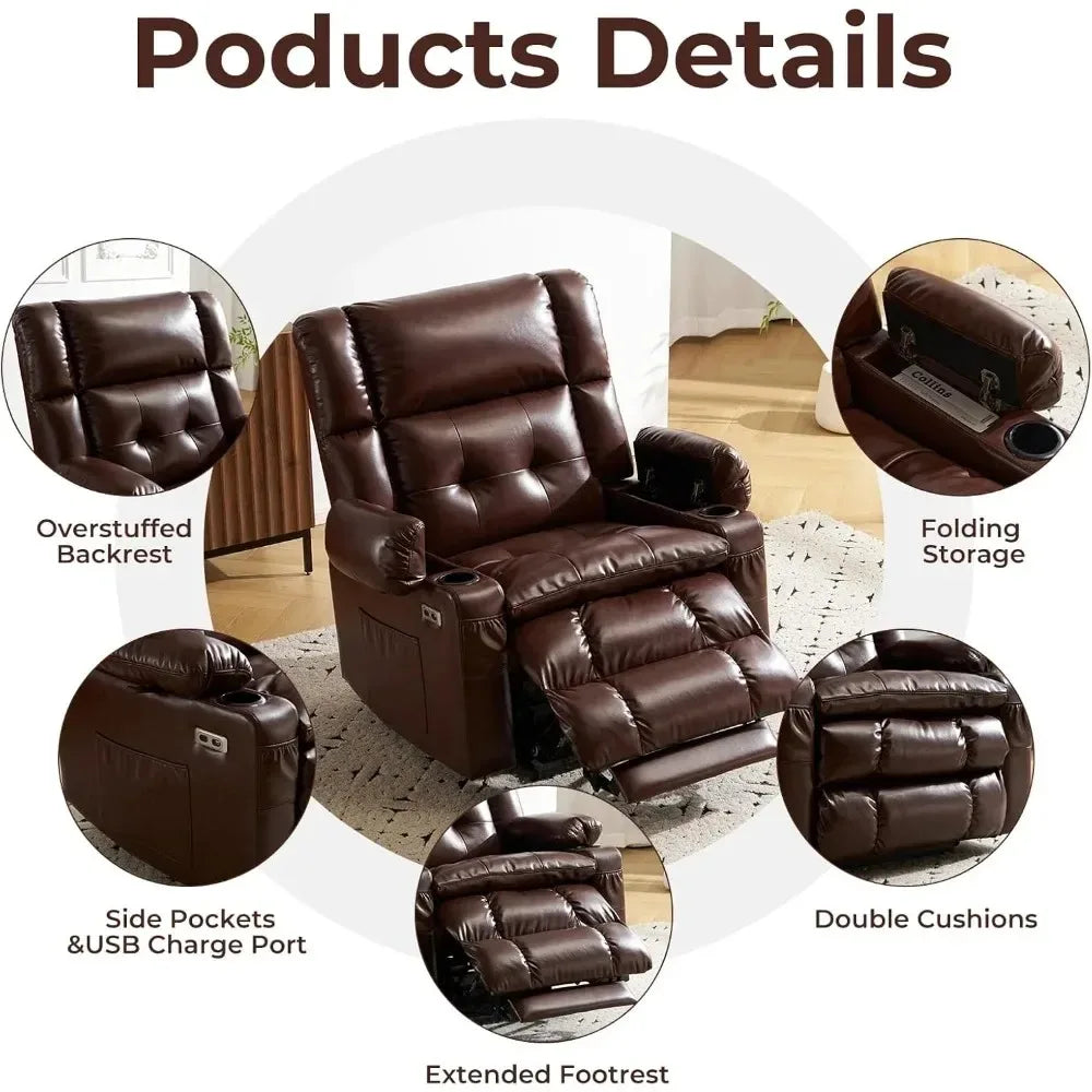 - Product Size & Multi-Functional Design: This electric recliner chair product size is 41.5" D x 36.5" W x 44" H, the seat size is 26" W x 20.5" D and the weight capacity is 350 lbs.Additionally, the leather recliner chair have arms storage, extended footrest ,USB Type-C charging ports, cup holders, two side pockets and two phone bags. Convenient for your daily use.The extended footrest allows you to raise your feet, lie flat and stretch out more.