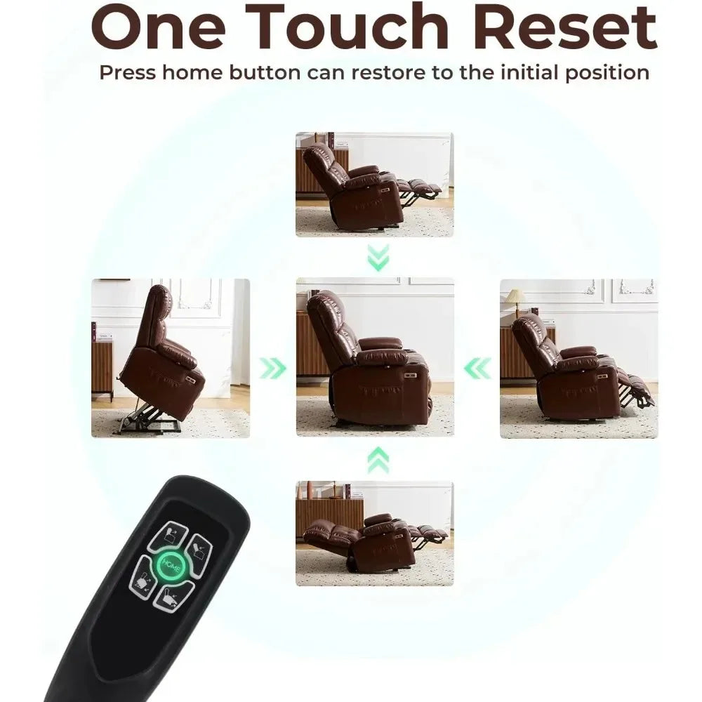- One-Touch Reset & Power Lift Assistance: Experience the convenience of the Home Button one-touch reset feature.This power lift recliner chair swiftly returns you from any recline position to a comfortable sitting posture. The dual motor counterbalanced lift mechanism ensures a gentle and safe lift to a standing position. The backrest and footrest of this extra wide recliner can be adjusted individually, facilitating easy standing for the elderly.