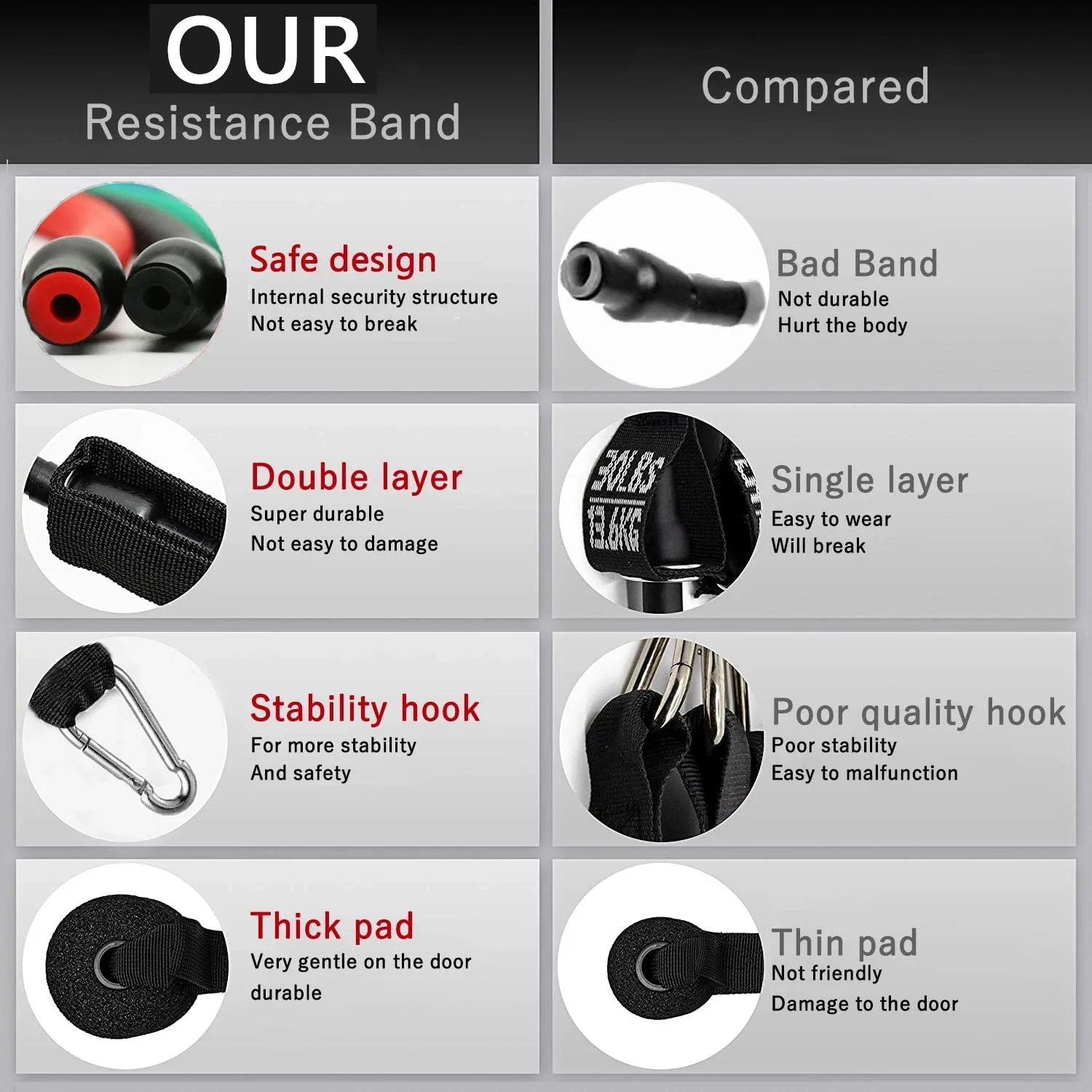 【High Quality 】- The connecting point where the ends of bands is attached to carabiner by the Nylon fabric,not the bands connecting carabiners directly,which quite different from that of others,providing absolutely much stronger durability when training.Carrying it conveniently to your home,office,gym or some outdoor occasion,perfect for workout fitness,like Yoga,Pilates,band resistance exercising and other training purpose