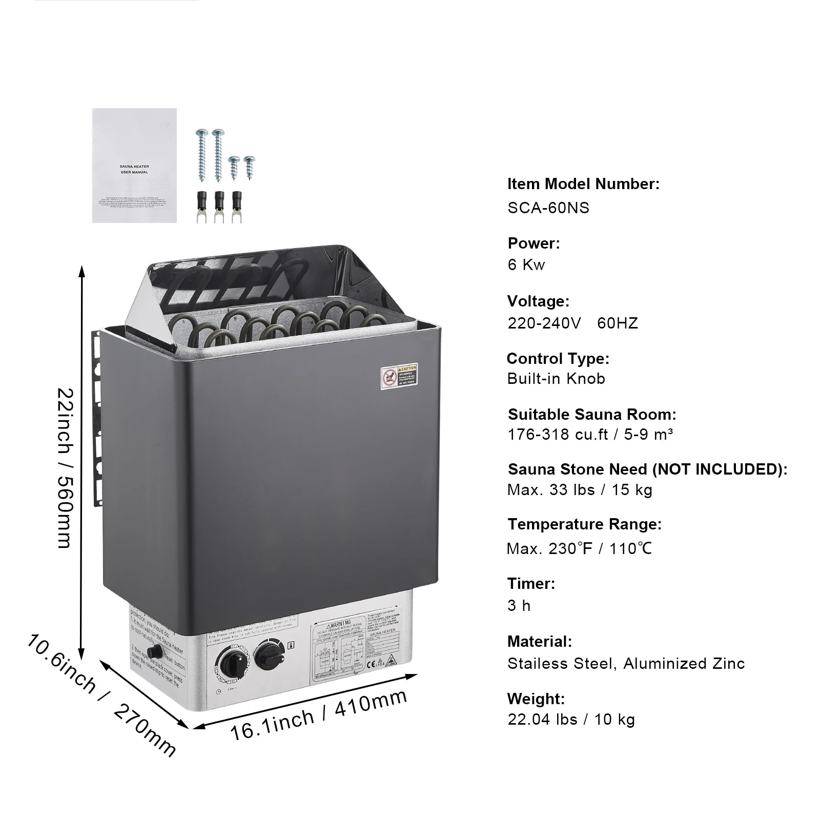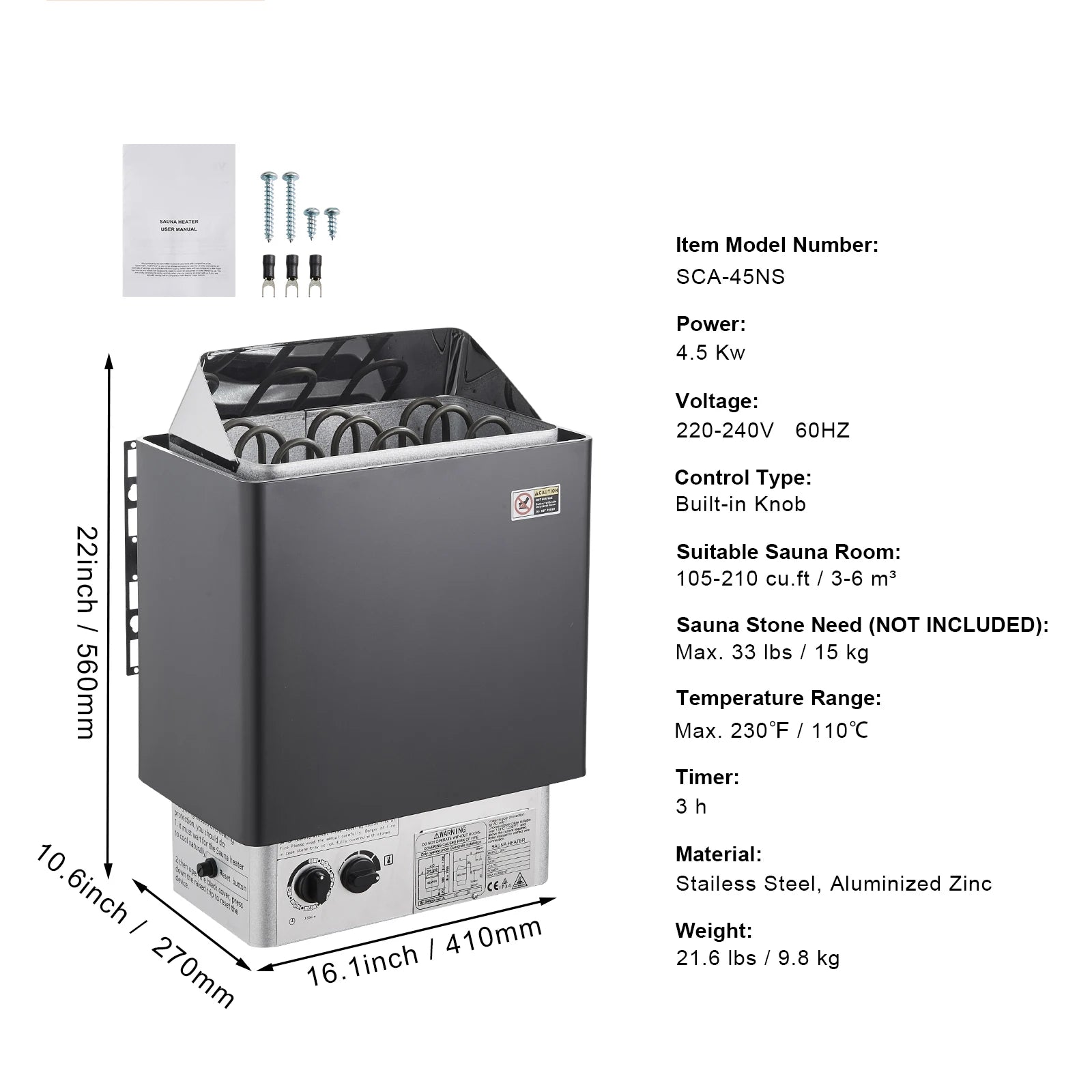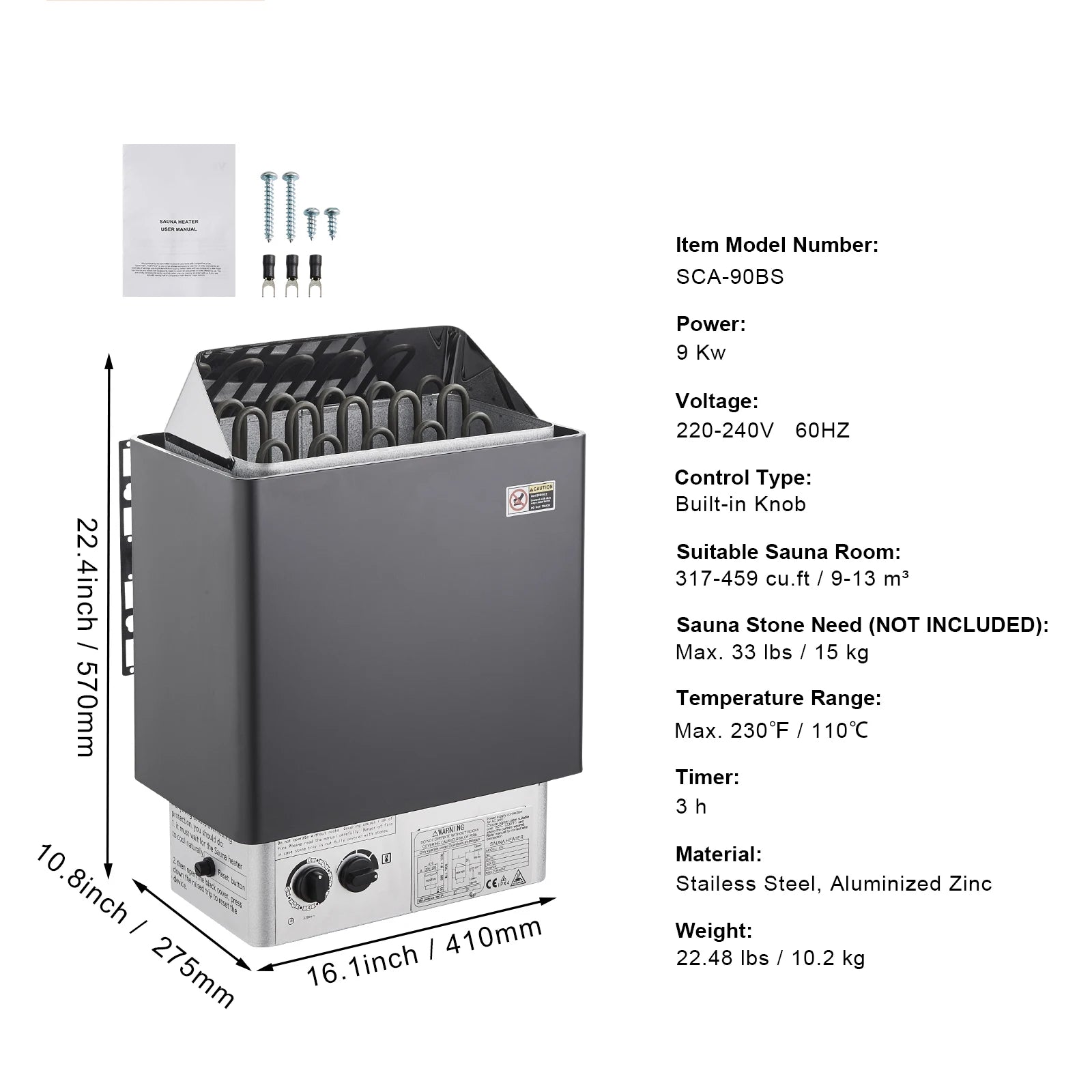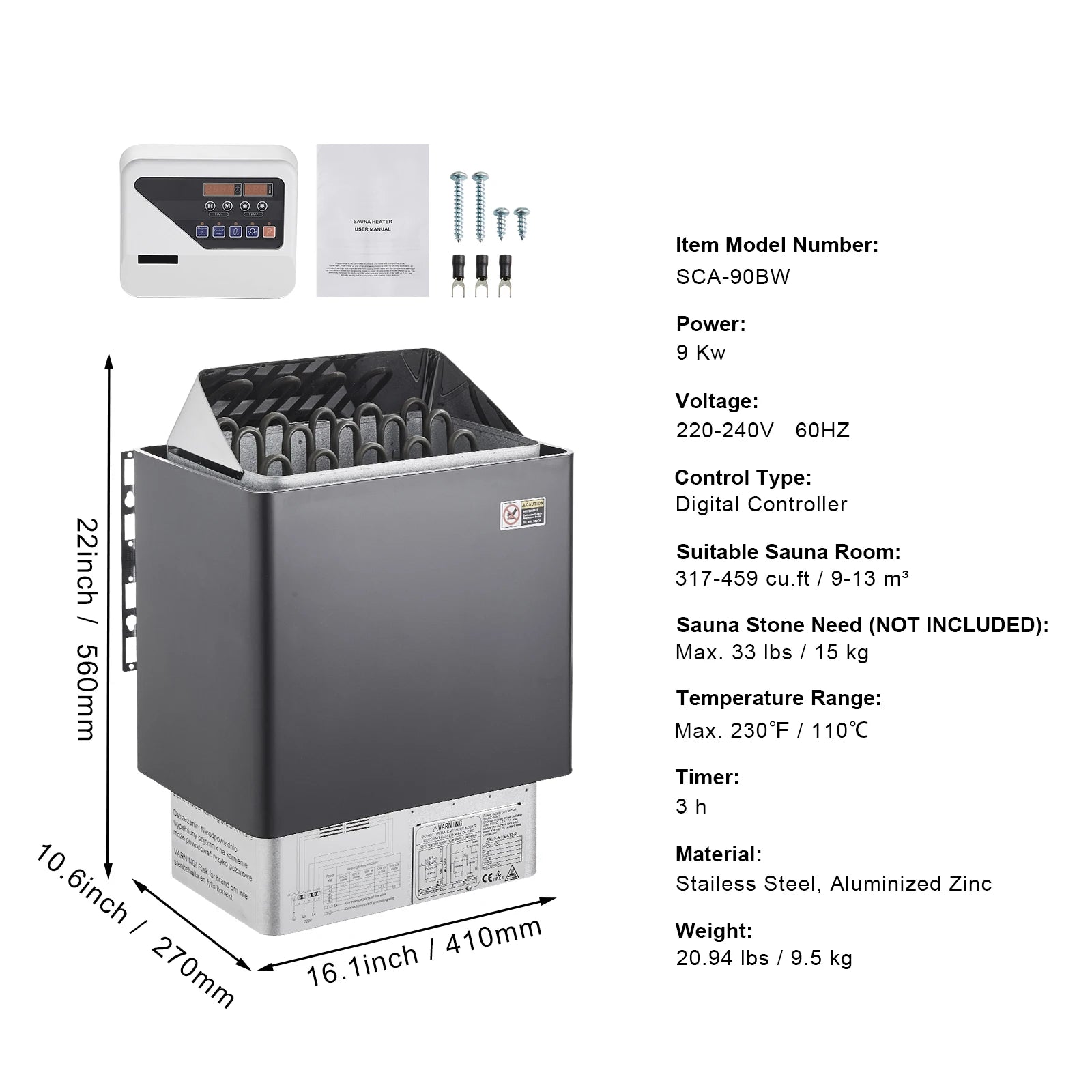 - Powerful, efficient heating: 9 kW at 220–240V (60Hz) warms a 317–459 cu ft sauna quickly, with a 3-hour timer and a 230°F max temperature.