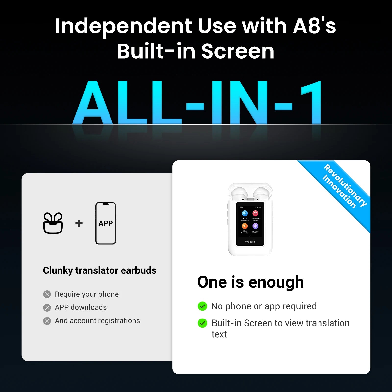 The Wooask A8 innovatively combines translation earbuds and a standalone translator, supporting 144 online languages + 16 offline packs for convenient, app-free communication.